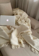 Koc bardzo ładny, kolor określiłabym jako jasno śmietankowy, który idealnie komponuje się we wnętrzu mieszkania. Przyjemny w dotyku i cieplutki. Jedyny minus, że ubrania są opylone od jasnego koca.