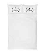 Komplet białej pościeli satynowej z indywidualnym haftem na poduszce.