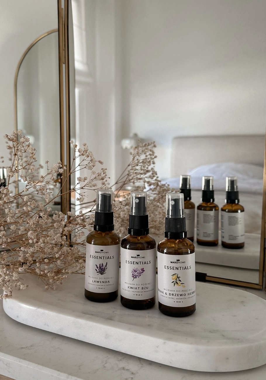 Mgiełka do pościeli MARO HOME to naturalna receptura oparta na hydrolatach i olejkach eterycznych, która nie powinna być mylona z perfumami do pościeli. W przeciwieństwie do intensywnych perfum, nasza mgiełka została stworzona z myślą o delikatnym odświeżeniu pościeli przed snem, nie przytłaczając zmysłów. Jej subtelny zapach, w zależności od ilości aplikacji, utrzymuje się od 15 do 45 minut, co pomaga stworzyć przyjemne warunki do zasypiania. Jeśli preferujesz, aby pościel pachniała przez cały dzień, rozważ wybór bardziej intensywnych, lecz nienaturalnych perfum do pościeli.