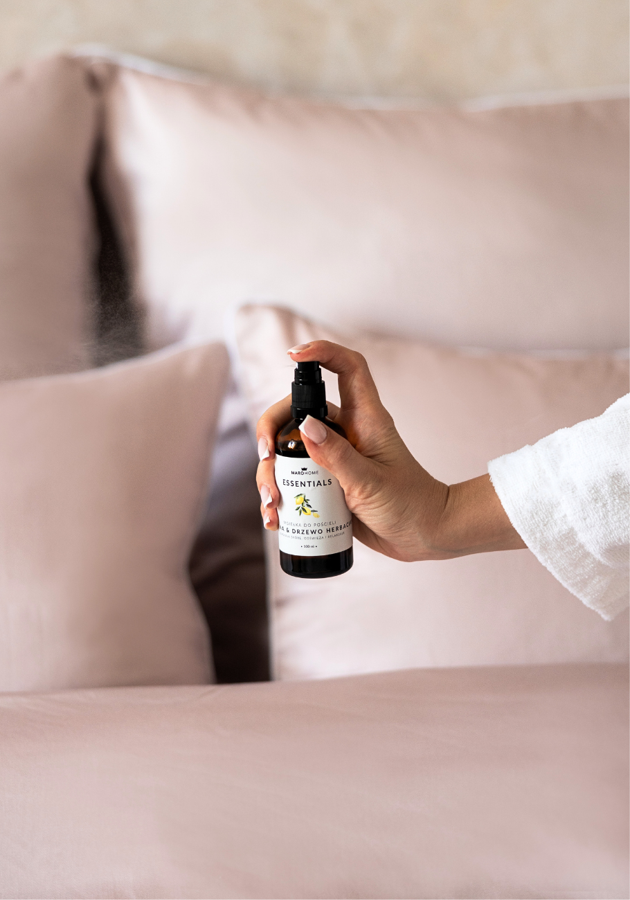 Mgiełka do pościeli MARO HOME to naturalna receptura oparta na hydrolatach i olejkach eterycznych, która nie powinna być mylona z perfumami do pościeli. W przeciwieństwie do intensywnych perfum, nasza mgiełka została stworzona z myślą o delikatnym odświeżeniu pościeli przed snem, nie przytłaczając zmysłów. Jej subtelny zapach, w zależności od ilości aplikacji, utrzymuje się od 15 do 45 minut, co pomaga stworzyć przyjemne warunki do zasypiania. Jeśli preferujesz, aby pościel pachniała przez cały dzień, rozważ wybór bardziej intensywnych, lecz nienaturalnych perfum do pościeli.