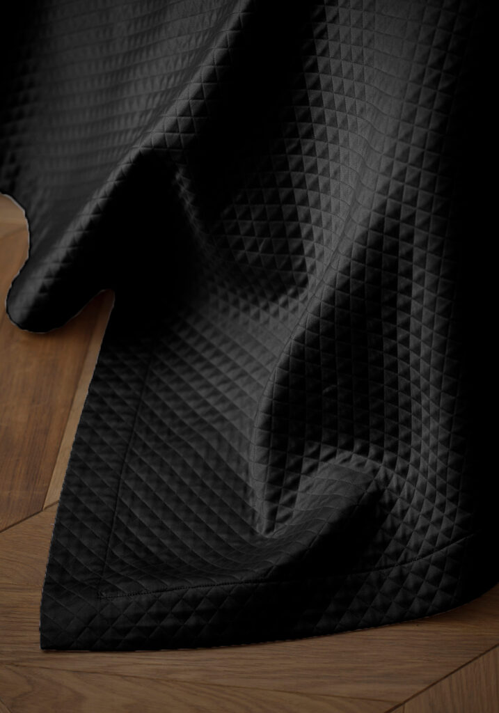 Narzuta z wyjątkowej tkaniny VELVET podszyta specjalną, dekoracyjną tkaniną zapobiegająca się zsunięciu z łóżka.