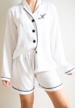 Biała tkanina w połączeniu z kontrastującą, czarną lamówką tworzy ponadczasową elegancję, która świetnie sprawdzi się zarówno podczas wieczornego relaksu, jak i leniwych poranków. Prosty, klasyczny krój z subtelnymi detalami nadaje jej wyrafinowanego charakteru, a lekkość i przewiewność tkaniny zapewniają wygodę przez cały rok – niezależnie od pory roku.