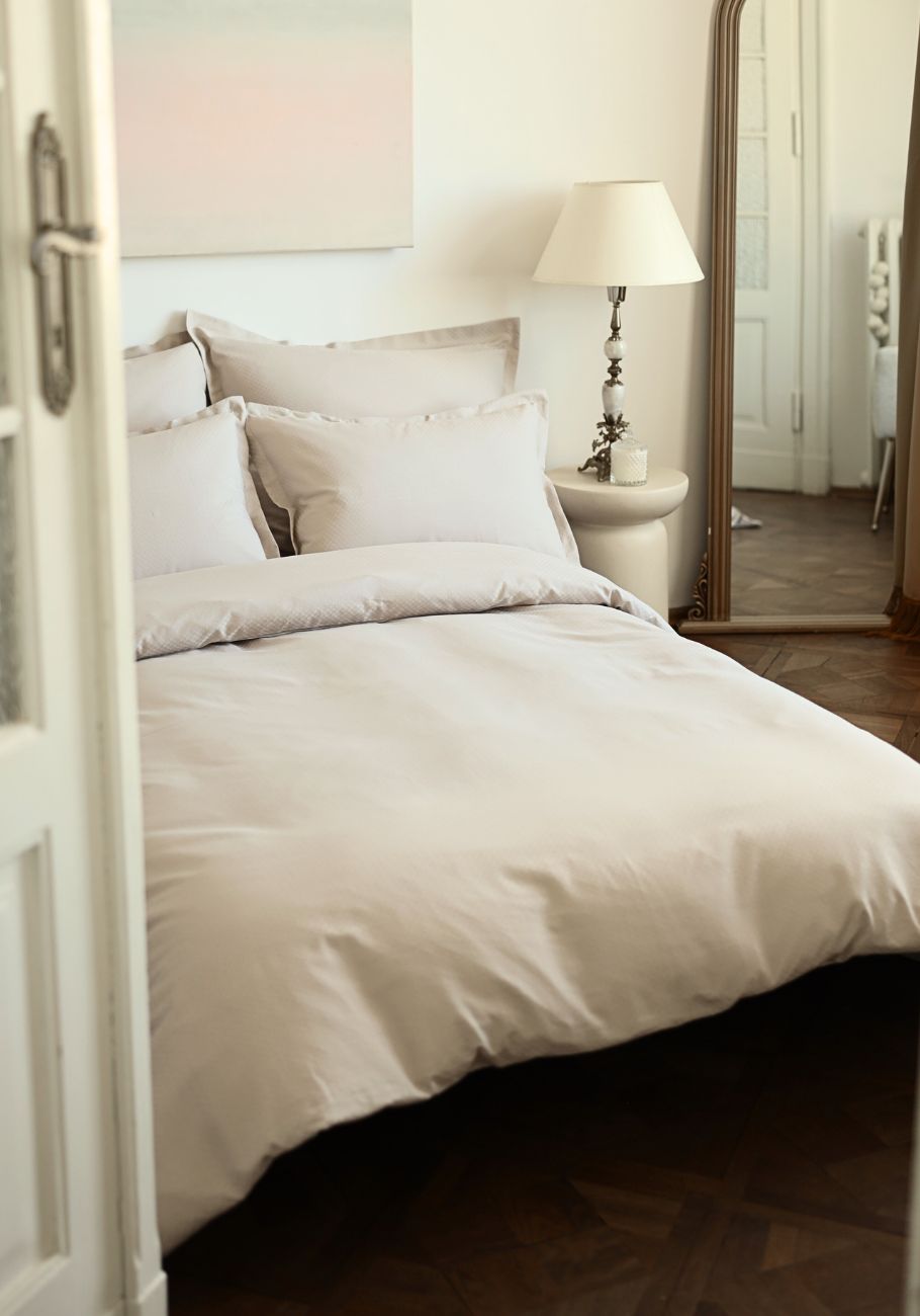 Wzór na pościeli nie blaknie. To zasługa wzoru wykonanego na krosnach, który przeplata satynowe i matowe nitki. Nadaje to również bardzo eleganckiego wyglądu, a pościel pasuje do sypialni w stylu klasycznym oraz nowoczesnym.