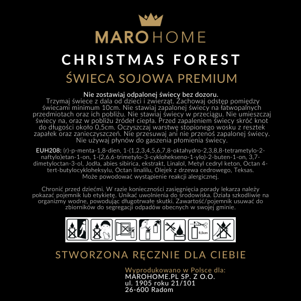 Christmas forest to kwintesencja świątecznej atmosfery, która przenosi Cię w serce zimowego lasu, oferując przy tym ciepło i spokój. Stworzona z naturalnego wosku sojowego, zapewnia intensywny, długotrwały aromat, który wypełni Twoje wnętrze magią najpiękniejszego czasu w roku.