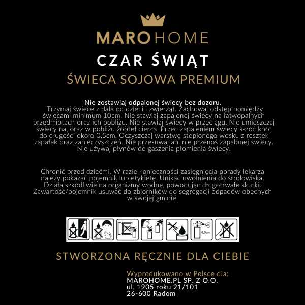Czar świąt to zapach wspólnych chwil – od porannego otwierania prezentów po wieczorne rozmowy przy blasku świec. Stworzona z naturalnego wosku sojowego, ta świeca zamieni Twoje wnętrze w prawdziwą świąteczną krainę. Rozpal ją i zanurz się w atmosferze pełnej ciepła, radości i bliskości, tak charakterystycznej dla najpiękniejszych dni w roku.
