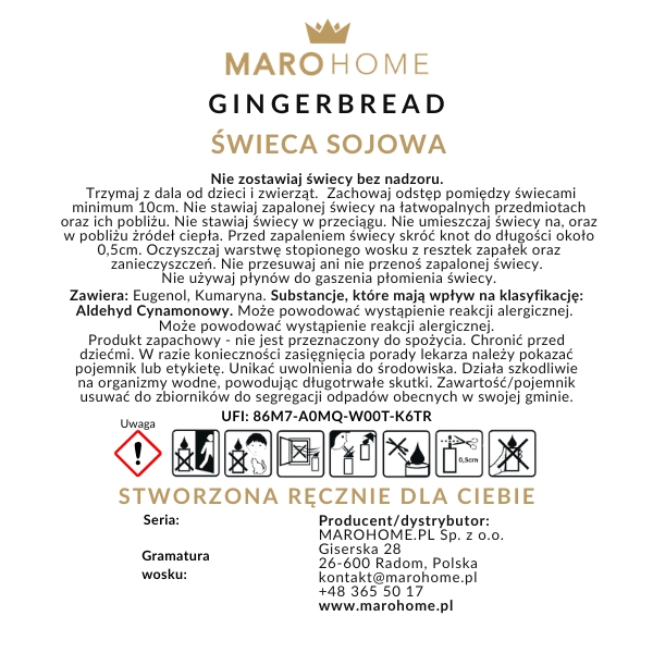 Gingerbread to esencja świątecznej przytulności, idealna do stworzenia ciepłej, rodzinnej atmosfery. Wykonana z naturalnego wosku sojowego, świeca oferuje intensywny, długotrwały aromat, który zamieni każdy dom w świąteczną krainę.