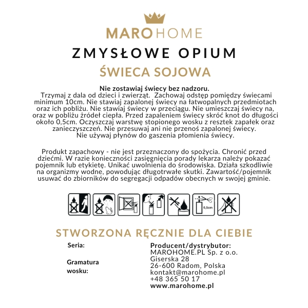 Informujemy, że karta charakterystyki (MSDS) dla naszych świec jest dostępna na życzenie. Jeśli są Państwo zainteresowani uzyskaniem informacji w niej zawartych, prosimy o kontakt z naszym zespołem obsługi klienta. Z przyjemnością udostępnimy dokumenty, aby zapewnić pełną przejrzystość i bezpieczeństwo użytkowania naszych produktów.