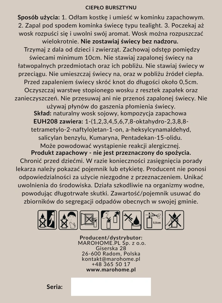 Każdy wosk powstaje u nas, w małej pracowni w Radomiu — od topienia, przez łączenie zapachów, po naklejanie etykiet. To praca rąk, nie maszyn. Drobne bąbelki czy minimalnie przekrzywiona etykieta to ślady rzemiosła, a nie wady.