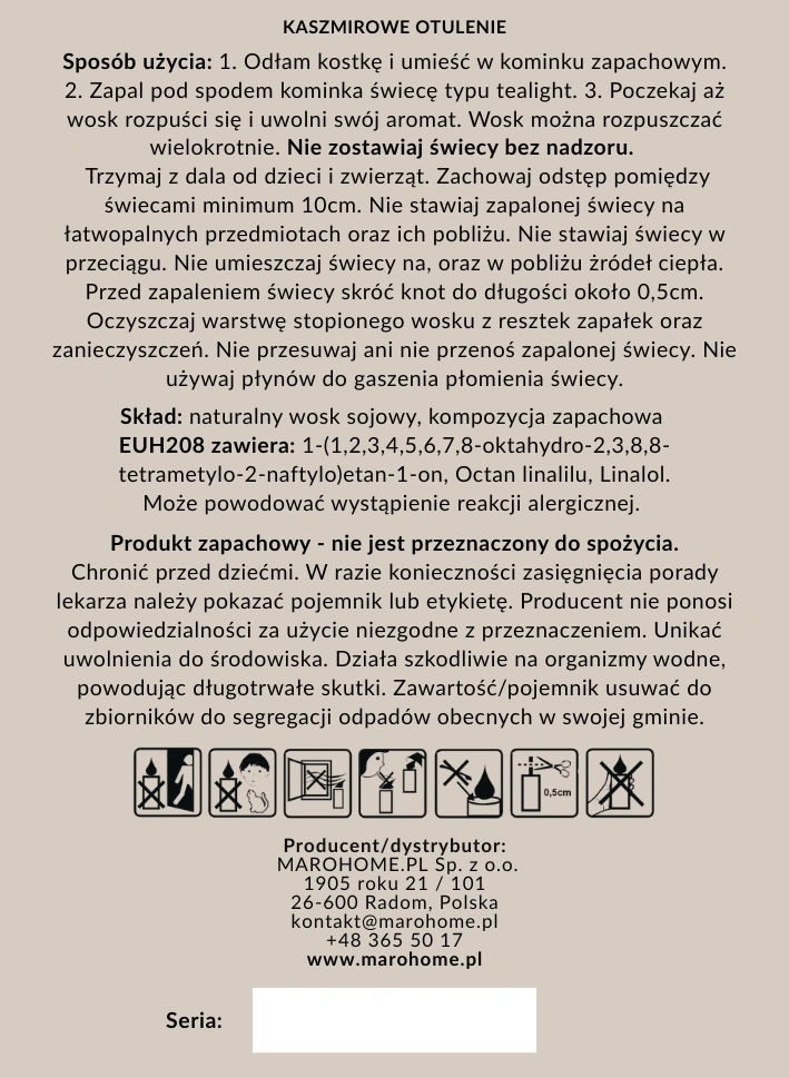 Każdy wosk powstaje u nas, w małej pracowni w Radomiu — od topienia, przez łączenie zapachów, po naklejanie etykiet. To praca rąk, nie maszyn. Drobne bąbelki czy minimalnie przekrzywiona etykieta to ślady rzemiosła, a nie wady.