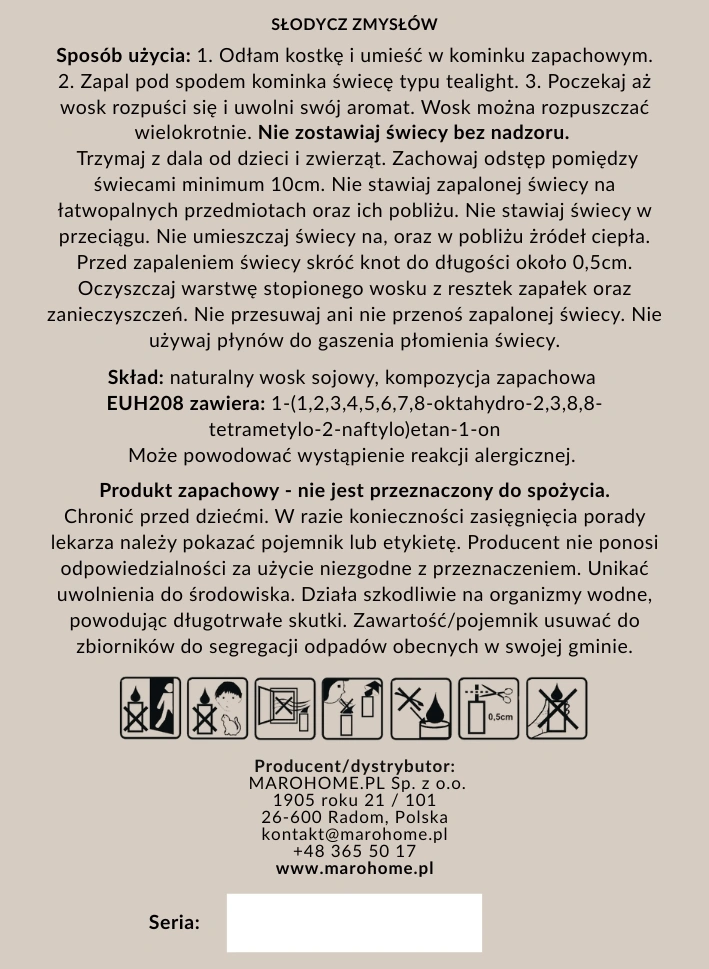 Każdy wosk powstaje u nas, w małej pracowni w Radomiu — od topienia, przez łączenie zapachów, po naklejanie etykiet. To praca rąk, nie maszyn. Drobne bąbelki czy minimalnie przekrzywiona etykieta to ślady rzemiosła, a nie wady.
